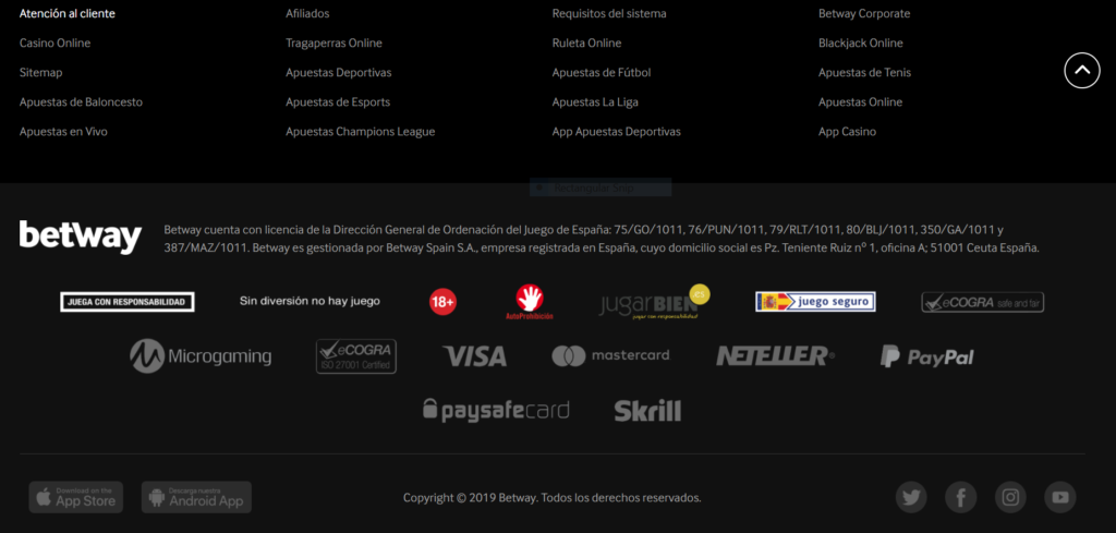 Pie de página del casino online Betway con los logos de las autoridades certificadoras, la DGOJ junto a métodos de pago