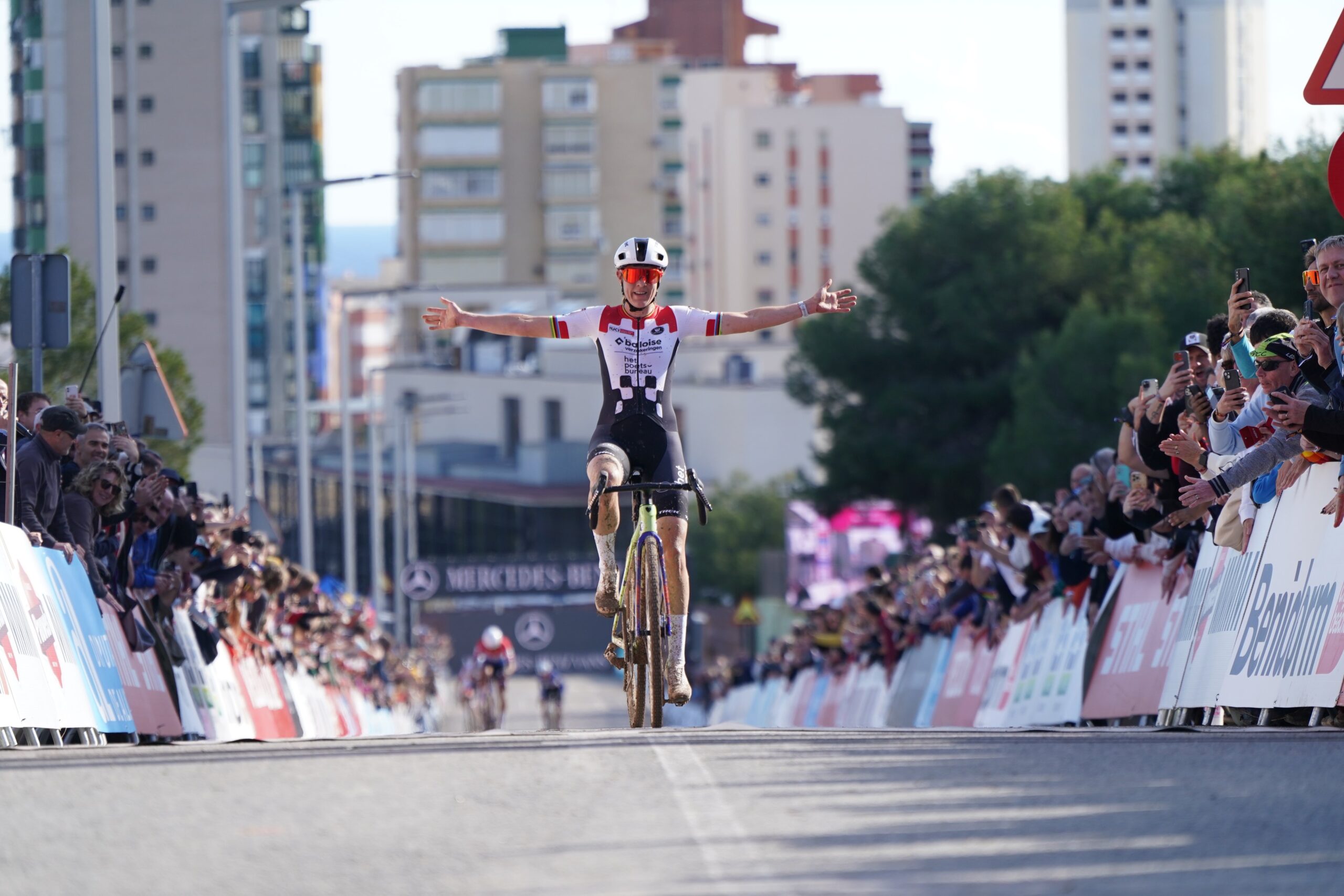 Mathieu van der Poel (Alpecin) ha vuelto a impartir una lección magistral de ciclocrós, esta vez ante la apasionada afición levantina en la Copa del Mundo de Benidorm. El actual campeón del mundo no ha dado opción a la sorpresa y ha sumado su décima victoria de la temporada con una exhibición en solitario que rompió la carrera mucho antes de lo previsto. Lejos de los finales ajustados de años anteriores en este circuito, el neerlandés cruzó la meta con una amplia ventaja sobre el belga Thibau Nys (Baloise), segundo clasificado, y el ídolo local Felipe Orts (Ridley), que hizo vibrar al público al cerrar el podio en tercera posición.