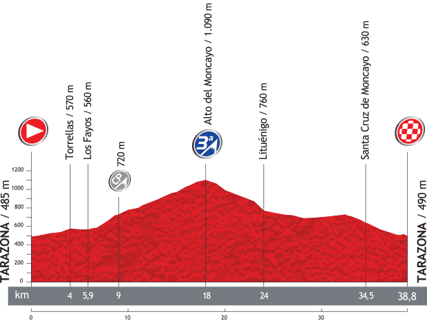 Un viaje de ida y vuelta con la ascensión puntuable al alto del Moncayo (3ª) y en la que tambien jugarán sus cartas el calor, con temperaturas previstas por encima de los 30º, y el viento de sureste, que se mantendrá estable durante la etapa y que soplará de costado en buena parte de la crono. Horner, maillot rojo, será el último corredor en tomar la salida. El alemán Tony Martin y el suizo Fabian Cancellara son los aspirantes principales a llevarse la etapa.