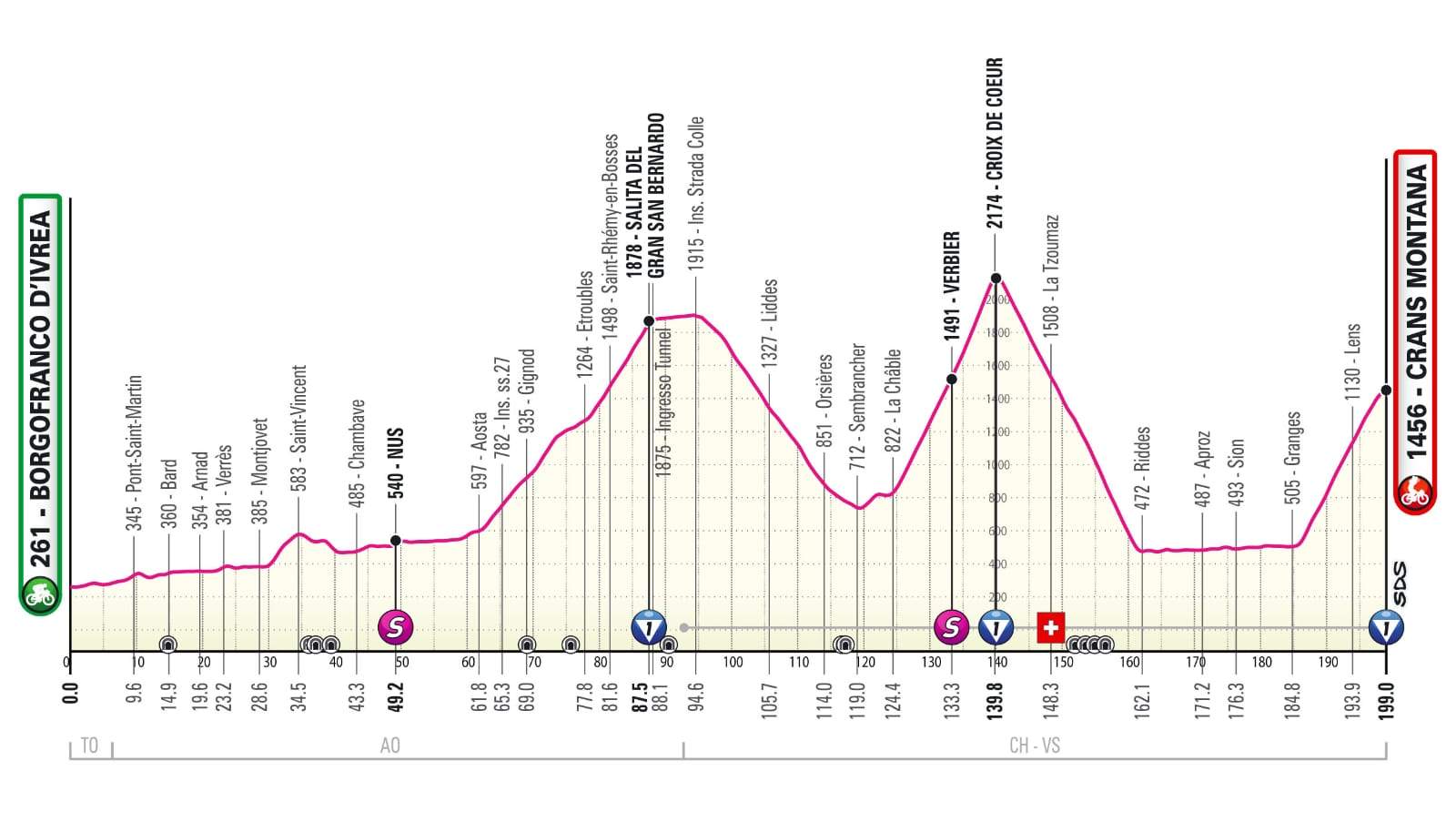 Etapa alpina y segundo final en cuesta del Giro. Tiene la clásica configuración alpina con una aproximación plana ligeramente ascendente seguida de una serie de subidas muy largas intercaladas a su vez por sectores cortos y planos típicos de los valles en forma de U de los Alpes occidentales. Subimos el Colle del Gran San Bernardo, que se ha visto recortado por las fuertes nevadas. Sigue un descenso igualmente largo, en parte por la carretera cubierta que sigue el túnel. A continuación, se pasa por la Croix de Coeur (15 km x 1350 m snm) otro paso de más de 2000. Segundo descenso de más de 22 km y después de un corto y plano ascenso final a Crans Montana desde un lado inusual en comparación con las aproximaciones habituales a la estación.