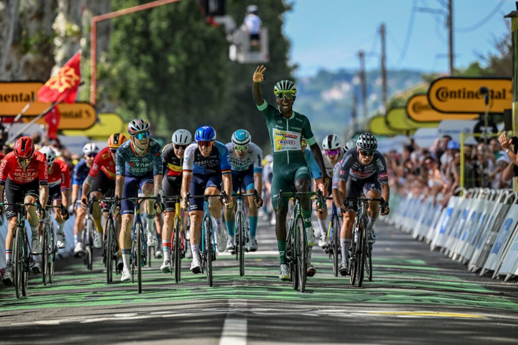 Seguro que desde su abandono en el Giro de Italia, Biniam Girmay, se había imaginado levantando los brazos en el Tour de Francia aunque fuera al menos una vez. Pues bien, ya van tres. El eritreo sigue haciendo historia junto al equipo Intermarché acumulando tres éxitos en la ronda gala. Esta vez el esprínter de 24 años remontó a Wout Van Aert (2º) y Pascal Ackermann (3º) que ocupó finalmente un cajón del podio en lugar de un Arnaud Démare que fue relegado de la tercera plaza. Lo mismo le ocurrió a Mark Cavendish que fue quinto, pero los jueces intervinieron posteriormente mandándole al fondo de la clasificación.