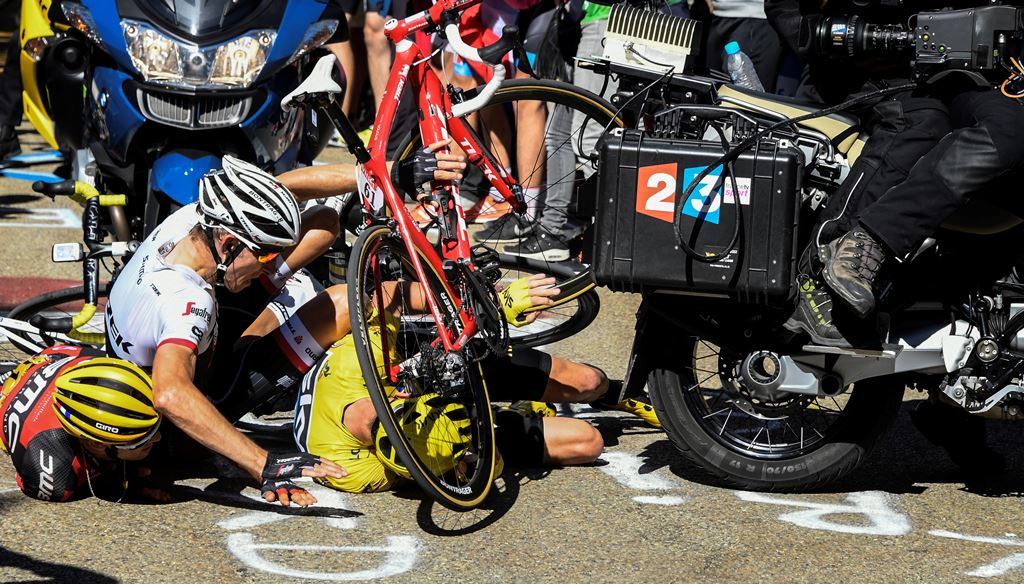 Doscientos francos suizos tuvo que pagar hace apenas pocos días el británico Chris Froome (Sky) por lanzarle un puñetazo a un espectador colombiano que, corriendo demasiado cerca del manillar del líder del Tour de Francia, estaba poniendo en riesgo la integridad física del corredor. Doscientos francos suizos por un puñetazo que causó un importante y efímero –marca de la casa– debate sobre la seguridad que, especialmente en las etapas de montaña, existe alrededor de los corredores. Un debate tan vivo y tan efímero, de nuevo, como el que viviremos los próximos días sobre la presencia de motos en carrera. Esas motos, en este caso la de la televisión francesa, que han vuelto a condicionar, y de qué manera, el resultado de una carrera ciclista. En este caso, el resultado final de todo un Tour de Francia que hoy, en las rampas del capado Mont Ventoux, ha vivido un absoluto caos que ha dejado una de las imágenes más surrealistas que podamos recordar: el líder del Tour de Francia corriendo a pie hacia el Chalet Reynard tras haber roto su bicicleta en una caída.