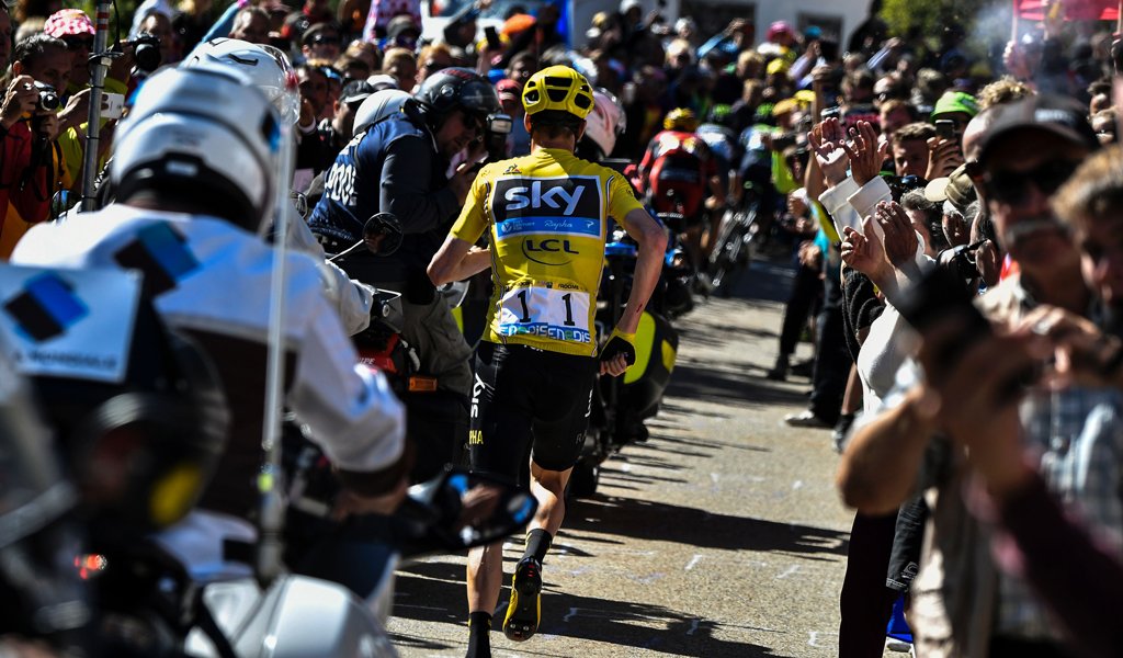 El que corría (a pie), no era otro que un Chris Froome que sólo segundos antes le estaba ganando el Tour de Francia a Nairo Quintana. El que, desesperado, hacía running montaña arriba no era otro que aquel que había dejado clavados a todos sus rivales y que embutido en un pasillo humano casi imposible, rodaba en ese instante a rueda de Porte y Mollema.