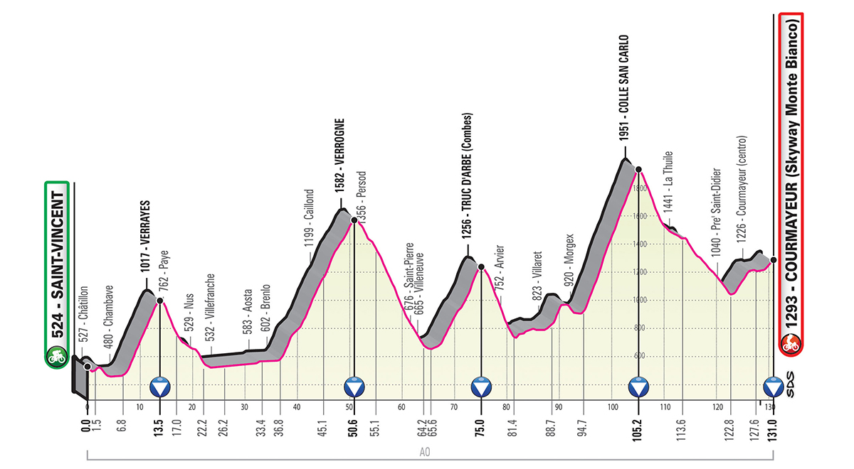 Empacho en la decimotercera etapa y la primera con un final cuesta arriba. El recorrido estaba salpicado de ascensiones que sobre el papel se catalogaban como segundas como el Colle del Lys, la primera prueba del algodón a tan solo 55 kilómetros del inicio. A ochenta kilómetros, el exigente Pian del Lupo, una trampa de segunda que se incluía por primera vez en la historia del Giro para finalmente, en una ascenso total de 44 kilómetros, escalar al Ceresole Reale hasta el lago Serrù, donde se había trazado la línea de meta. 196 kms de menú del día.