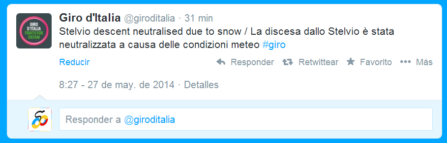 Y es que la organización del Giro de Italia, en plena subida al Stelvio, anunció en su perfil oficial que la bajada del mítico puerto y cima Coppi se haría de manera neutralizada por culpa de las dantescas condiciones atmosféricas -nevando y 0º- y nunca fue así de manera oficial. Por «Radio Corsa», la información interna que tienen todos los vehículos acreditados y los equipos, jamás se anunció tal información, como confirmó en meta el director de la prueba Mauro Vegni. «Los directores no tienen que seguir Twitter, solo oír Radio Corsa, y si dudan, que pregunten… En ningún momento se habló de neutralización. Si te juegas el Giro debes confirmar todas las informaciones. Y ningún director lo hizo. La comunicación se interpretó mal. Yo dije que las motos al principio marcarían la trayectoria más segura. Nada más», como recogió el periodista Carlos Arribas. El problema es que el locutor de la emisora sí parece decir lo contrario (oír grabación) creando el caos en la carrera y después de ella
