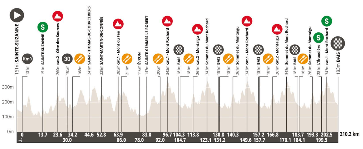 Después del prólogo inaugural, llegó la primera etapa en línea a los Boucles de la Mayenne sobre un recorrido de 166 km que unía Saint-Berthevin y Juvigné, sin grandes dificultades hasta el circuito final, que debía completarse en cuatro ocasuines con la Côte du Pas de Pierre (1,6 km al 3,7%) como principal obstáculo.