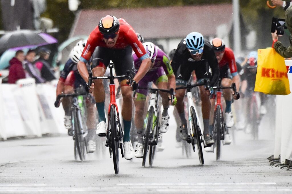En ese momento de carrera, la lluvia jugó un papel determinante. Ya metidos de lleno en el circuito final que contaba con una ascensión y su posterior bajada, el trazado estaba lleno de agua que complicó a los ciclistas en cada curva que tomaban. Ninguno se precipitaba, a expensas de evitar una caída. En Bahrain quisieron tensar la cuerda y pusieron a Matej Mohoric a liderar el pelotón. El campeón de la Milán San Remo provocó cortes en el grupo y seleccionó la carrera. El esloveno iba tan sobrado que se dio el lujo de atacar en el descenso de la cota a falta de 5 km de meta. Nadie puso seguir su rueda y abrió un hueco de 100 metros que los ciclistas de DSM no conseguían cerrar.