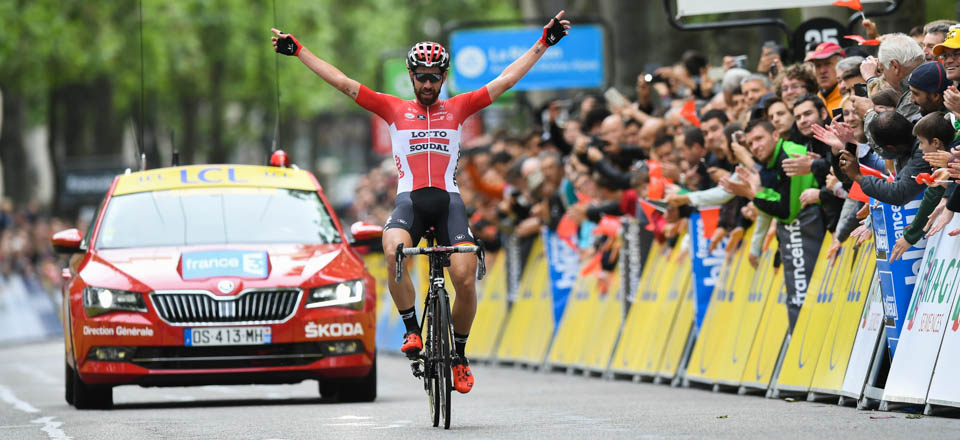 El belga Thomas de Gendt ha añadido otra fuga exitosa a su colección en la 1ª etapa del Dauphiné (World Tour) después de dejar a sus acompañantes -entre los que estaban los españoles del Delko, Delio Fernández y Ángel Madrazo– para vestir el primer maillot amarillo de la ronda francesa en las calles de Saint Etienne.