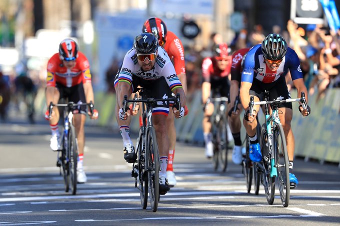 Con el sprint ya lanzado por los hombres de Deceuninck-Quick Step, Katusha-Alpecin y CCC, Sagan supo aprovecharse a la perfección del movimiento final de Ineos, que quiso lanzar al noruego Halvorsen, cuya rueda fue la perfecta para el eslovaco, que terminó superando en meta a Travis McCabe (EEUU) y Max Walscheid (Sunweb), que también superaron al de Ineos.