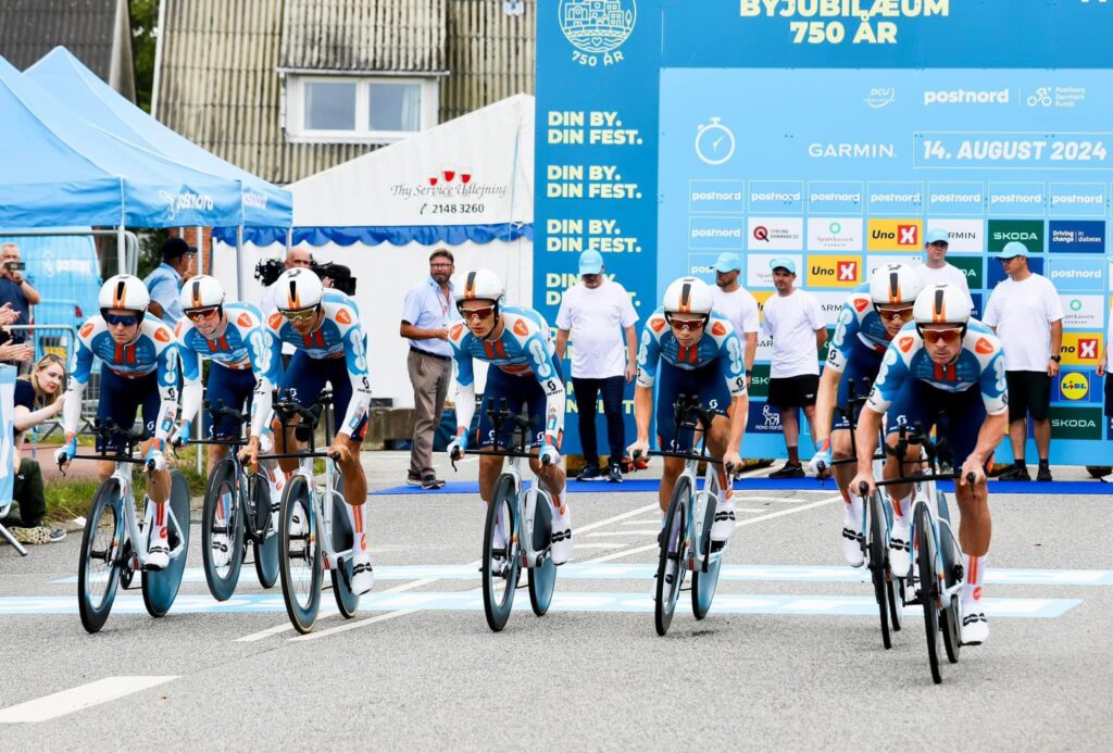 Victoria del conjunto DSM en la contrarreloj por equipos que daba comienzo al Tour de Dinamarca. La escuadra neerlandesa fue la primera en tomar la salida, la primera en llegar a la meta lógicamente y la que mejor tiempo (14:30) terminó marcando en la localidad de Holstebro tras los 13 kilómetros de recorrido. Eso sí, ganaron por 20 centésimas. Apretadísimo. El conjunto UAE igualó ese registro, pero por media pedalada se les escapó el triunfo. Un duelo el de DSM vs UAE que resultó espectacular. Y eso que ninguno de ellos marcó el mejor tiempo en el único punto intermedio.