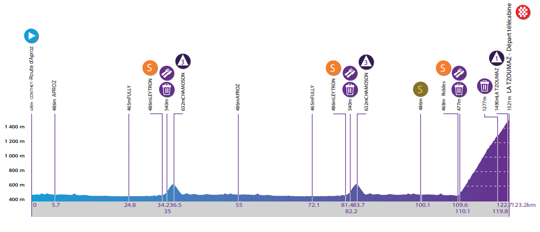 2ª: Sábado 16 agosto. Conthey (10:30 h) – La Tzoumaz (14:15 h) (123,2 km)