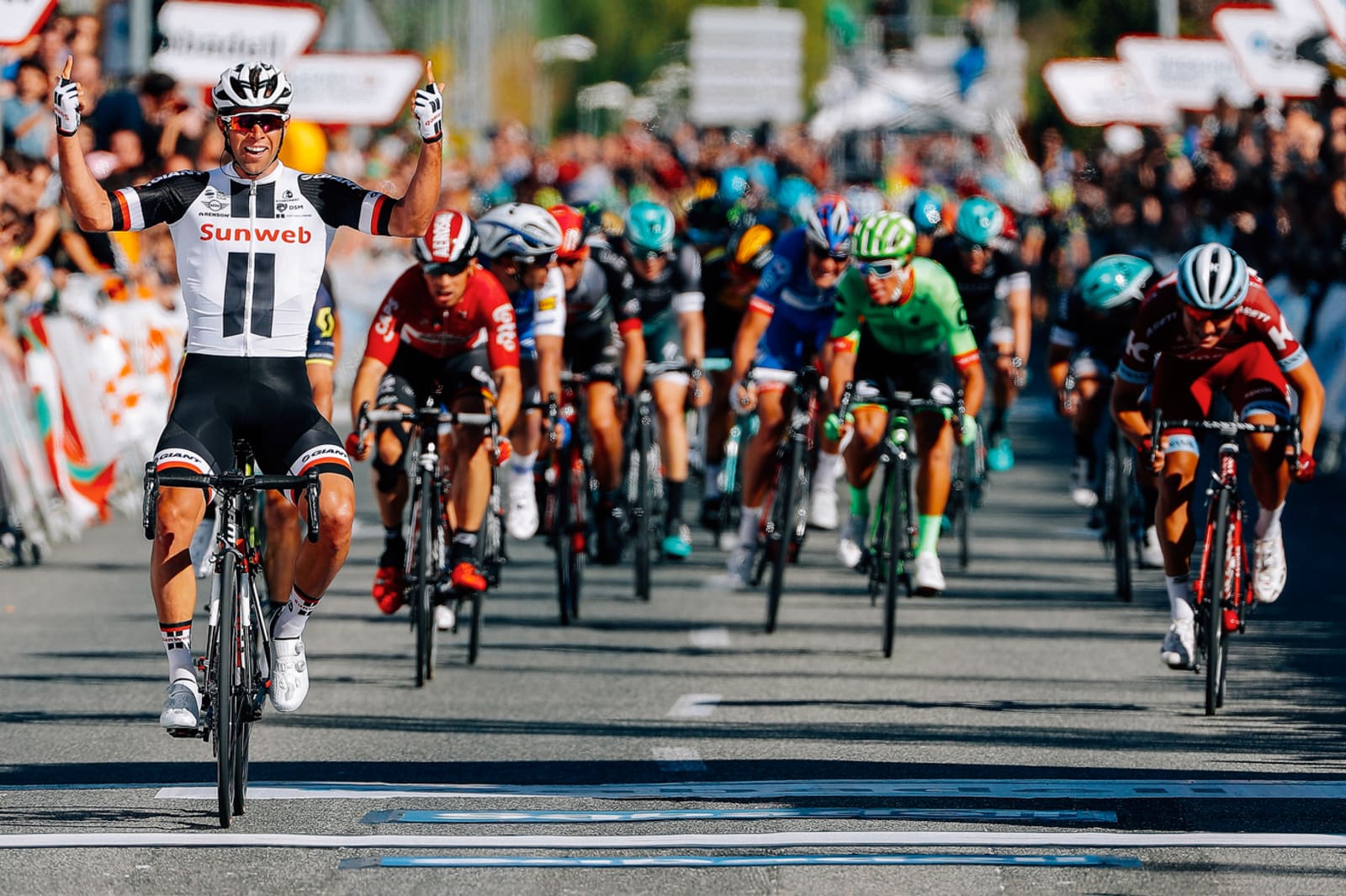 Un estrechamiento de carretera en los 5 kilómetros finales alteró algo el guion con el ataque de Bart Wellens, primero, y Julian Alaphilippe, después. Pero el francés reventó una de sus ruedas en plena fuga lo que permitió su caza. Roche fue el siguiente marcado por Valverde, pero en el kilómetro final todo se compactó para generar la llegada masiva con epílogo de las antípodas.
