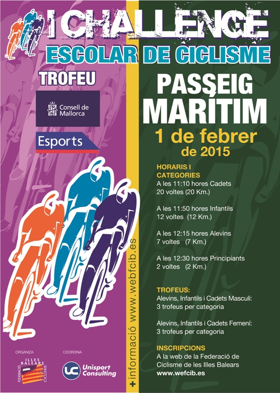 Durante la celebración del Trofeo Playa de Palma-Palma, mañana domingo 1 de febrero, de la XXIV Challenge Ciclista Mallorca, los más pequeños serán los protagonistas en el Paseo Marítimo de la capital mallorquina, ya que se celebra la Challenge Ciclisme en Edat Escolar-1er Critèrium Passeig Marítim, patrocinada por el Consell de Mallorca, con un circuito de 1 km. en el Paseo Marítimo de Palma.