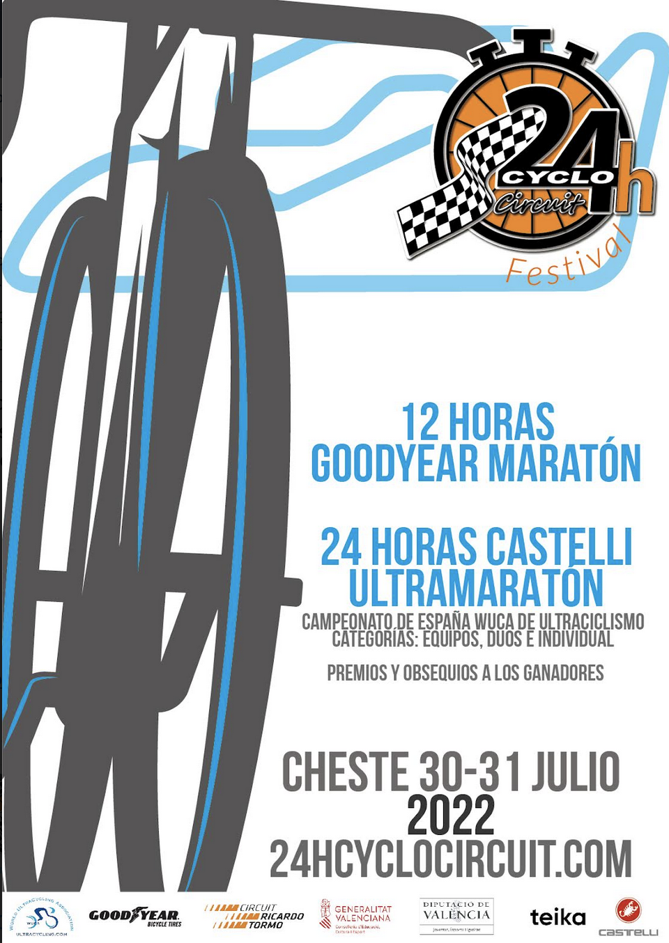 Los próximos 30 y 31 de julio de 2022, en el circuito Ricardo Tormo, se celebrará la séptima edición de las 24 horas Cyclo Circuit Festival con tres carreras 24h Castelli Ultramaratón Campeonato de España de ultrafondo WUCA en las categorías de solitario, dúo y equipos (masculino, femenino y mixto) 12h Goodyear maratón y LA VELO´z 60 km. a todo gas.