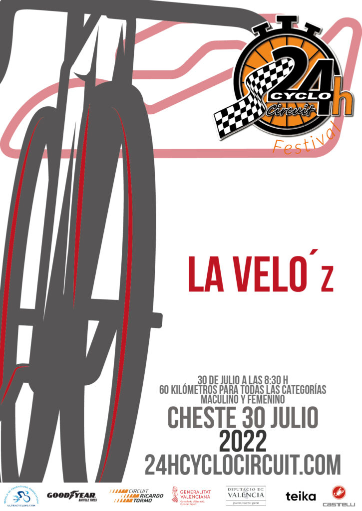 LA VELO´z se disputará en el Circuito Ricardo Tormo de Cheste, Valencia el próximo 30 de julio a las 8:30 horas. Es la primera prueba que se celebra en el festival de ciclismo de las 24 Horas Cyclo Circuit