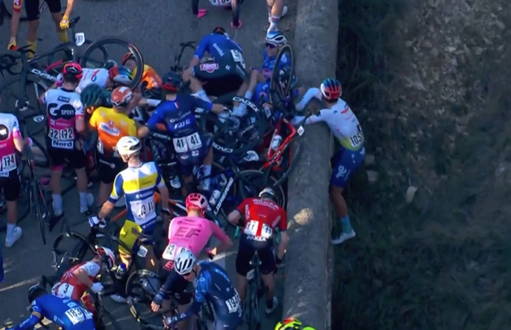Con el pelotón dividido en dos tras una primera caída, el grupo del líder Arnaud de Lie y de Mads Pedersen abría un hueco respecto al segundo pelotón. La velocidad de la persecución era enorme y al paso del grupo perseguidor por un puente –algo estrecho- se produjo la gran caída. Muchos corredores al suelo y otros como Valentin Ferron terminaron colgados del puente. Sobrecogedora la imagen. El ciclista de TotalEnergies se agarró al muro para no caer al río, mientras un buen número de ciclistas quedaban atrapados entre tantas bicicletas.