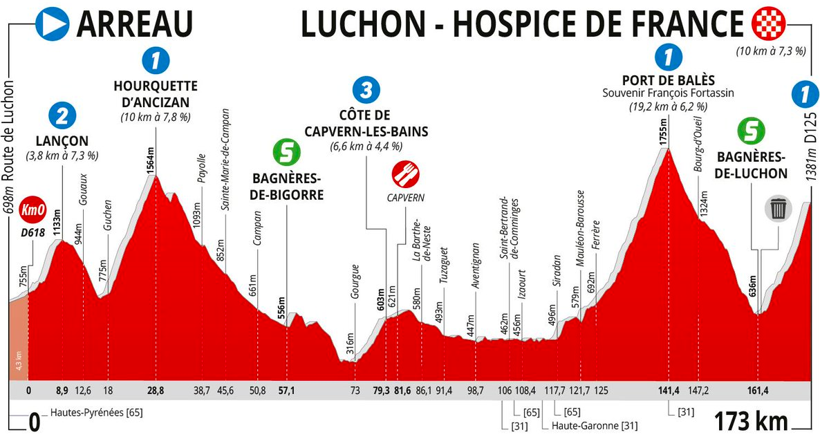 La tercera etapa de la Ruta de Occitania está considerada la jornada reina, de 173 kilómetros entre Arreau y el inédito final en el Hospice de France (10.3km al 7.3% de pendiente media) después de superar otros dos puertos de primera categoría: Hourquette d’Ancizan (10km al 7.8%), en el tramo inicial, y Balès (19.2km al 6.2%), justo antes de la última subida.