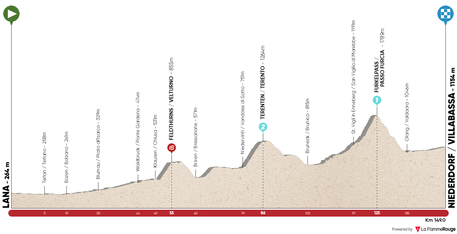 El pelotón solo logró dar caza en esta primera subida a Chris Hamilton (DSM) e Iván Cobo (Kern Pharma), que habían quedado intercalados. Quien sí logró su propósito a base de empeño fue Carl Fredrik Hagen (Israel), que tras casi una hora en solitario llegó a la cabeza. Sin embargo, pagaría este esfuerzo en la posterior ascensión. Pese a contar con Pernsteiner en cabeza, que hacía de freno al igual que su compatriota, el conjunto Bahrain inició en el descenso un trabajo que se extendería durante los siguientes 130 kilómetros. Su entrada en los relevos imprimió más velocidad al grupo y permitió recortar un minuto a los escapados antes de comenzar el Mendelpass.