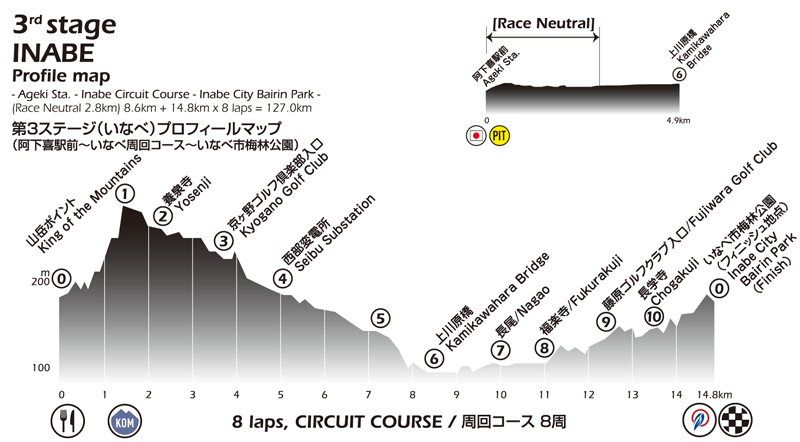 La salida, desde Fugenji fureaino Eki, incluía un primer tramo de 4.2km para luego realizar 6 vueltas a un circuito de 16,8 kilometros que completaba 105 de jornada. Y, dado el perfil, se esperaba un sprint masivo en la meta de Kyoto, pero no fue así.