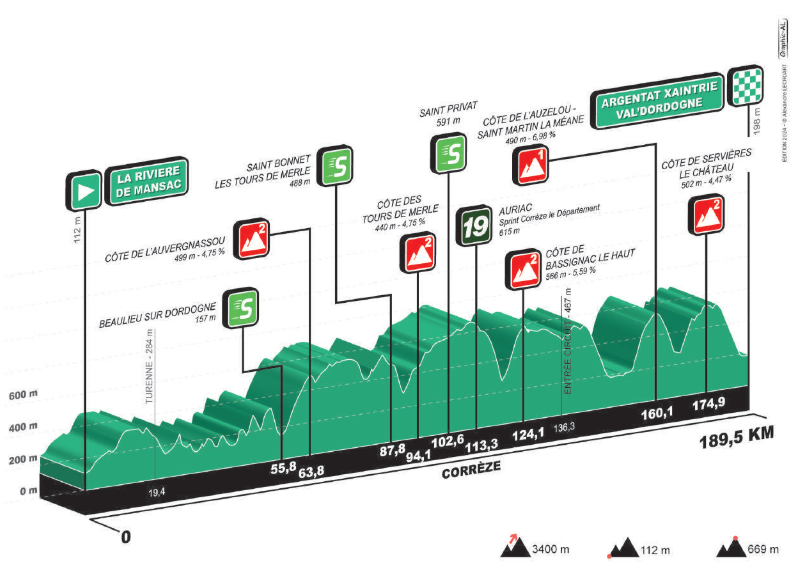 3ª: Jueves 15 agosto: La Rivière de Mansac (12:45)-Argentat Xaintrie Val’Dordogne (17:15), 189,5 kms