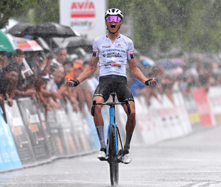 Tercer triunfo profesional y primero de la temporada para Alex Baudin que estrenó su casillero con una victoria en solitario en la segunda etapa del Tour de Limousin. Un logro importante para el corredor francés de 23 años que hasta la fecha ha conseguido el éxito de mayor nivel de su todavía corta trayectoria profesional. El ciclista del Decathlon se llevó el gato al agua -nunca mejor dicho- en un día marcado por las precipitaciones que hicieron todavía más épico el triunfo Alex Baudin