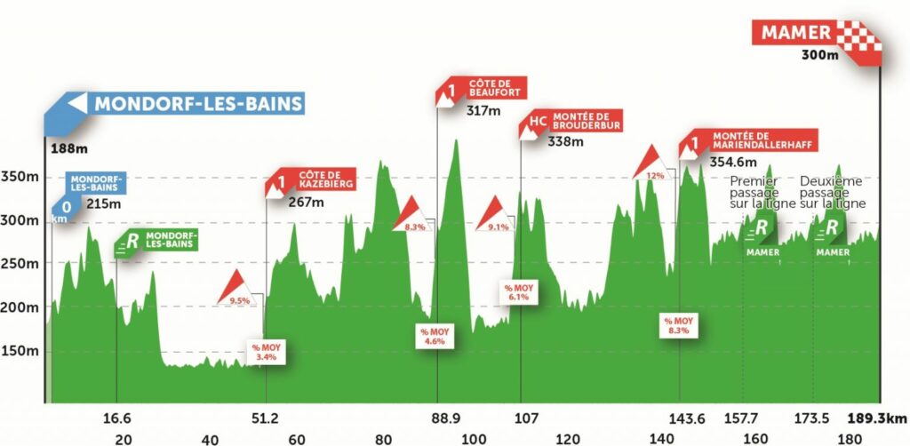 Kenny Molly (Bingoal), Sebastian Schönberger (B&B Hotels), Adam de Vos (Rally) y Kamil Gradek (Zabù) fueron los atrevidos a dejar el pelotón en un día pasado por agua. Ante esta situación el Groupama de Pinot y Gaudu y el UAE de Hirschi endurecieron aún más la carrera para desgastar al grupo de Almeida. Así en la subida a Eschdorf el pelotón principal apenas se quedó cin 30 unidades y la fuga concluyó a 30 kilómetros del final y antes del duro circuito.