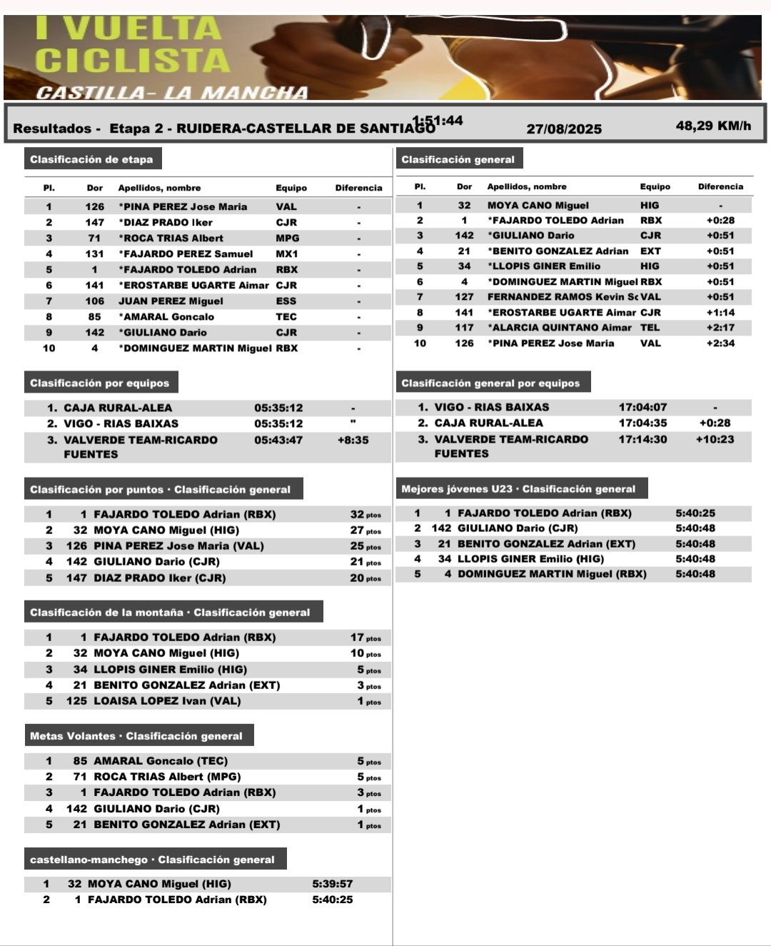 Más de 48 kilómetros por hora de media para el ganador de la segunda etapa de la Vuelta a Castilla-La Mancha, con la fuga triunfando en Castellar de Santiago y un José María Pina (Valverde Team) que levantó los brazos tras ser el más hábil en el final. Atento a los cortes, el líder Miguel Moya (High Level Gsport) confirmó su maillot y aumentó la diferencia sobre algunos adversarios en la clasificación general.