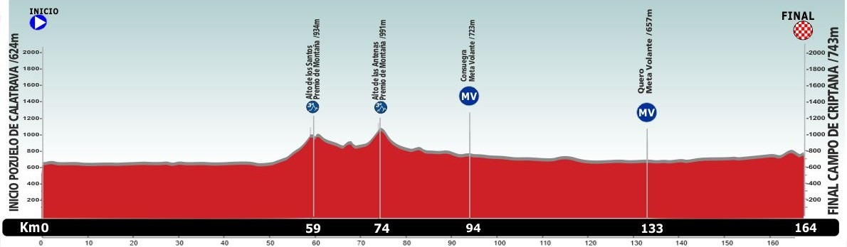 La Vuelta a Castilla-La Mancha disputará mañana su tercera etapa en las provincias de Ciudad Real y Toledo. La jornada más larga, con 164 kilómetros, concentra la zona más exigente en la parte central, tras una salida cómoda desde Pozuelo de Calatrava a las 10h. El primer paso puntuable de montaña será el Alto de los Santos (km 59) que se encadenará con el Alto de las Antenas (km 74). Todavía con 90 kilómetros por delante, y en un terreno que es favorable si sopla el viento para que se rompa el pelotón, se disputarán las metas volantes en Consuegra (km 94) y en Quero (km 133), ambos en la provincia de Toledo. El final en Campo de Criptana propone un repecho a menos de 5 kilómetros y la llegada a los molinos puede romper la unidad y dar la oportunidad a los ciclistas más explosivos.