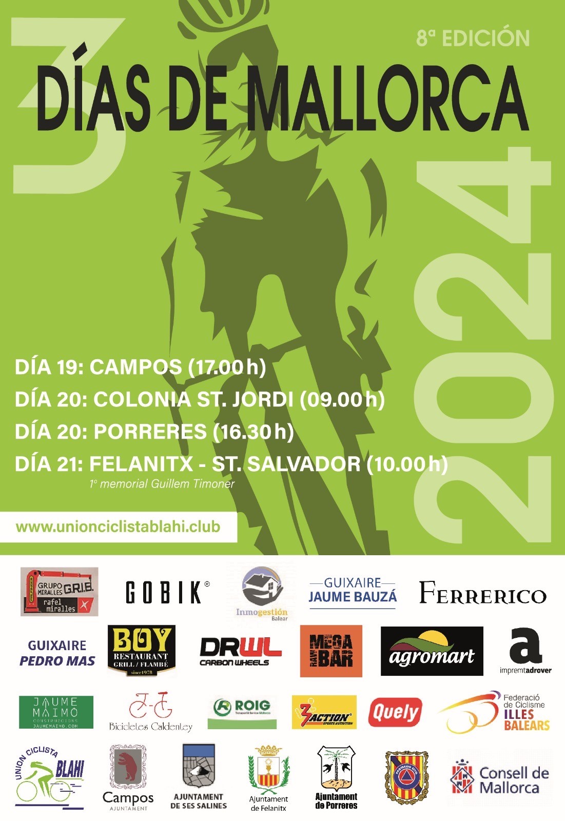 Los 3 días de Mallorca se disputarán entre el 19 y el 21 de abril de 2024, bajo la organización de la Unión Ciclista Blahi. La prueba balear para masters y féminas regresa un año más con cuatro etapas repartidas en tres días de competición en formato de circuito. La carrera arrancará en Campos y acabará con la jornada entre Felanitx y San Salvador.