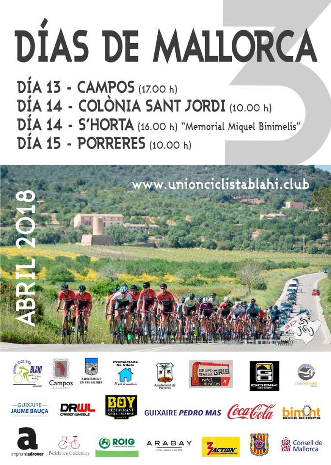 Del 13 al 15 de abril, la Unión Ciclista Blahi pondrá en marcha una nueva edición de la competición 3 Días de Mallorca, prueba reservada a corredores máster 30-40-50-60 y féminas que se disputa en la modalidad de challenge.