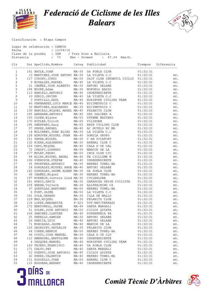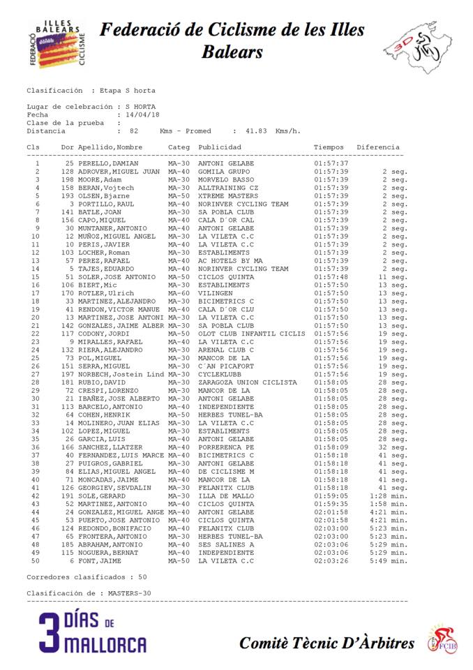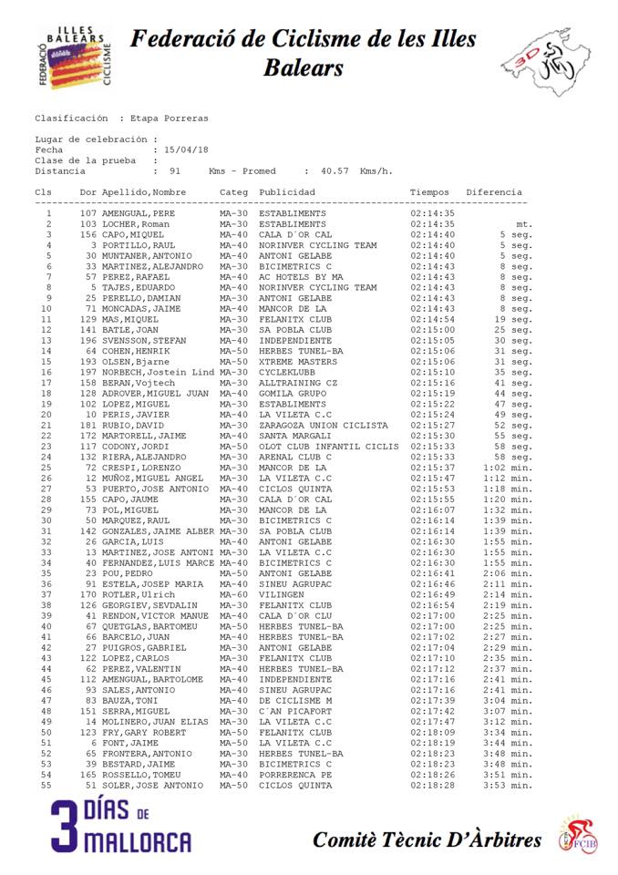 La etapa definitiva, con final en alto en la Ermita de Montision, en Porreres, registró la victoria de Pere Amengual, del Metal Blinds, con la segunda plaza de su compañero de equipo Roman Lochter con el mismo tiempo. En tercera posición cruzó la línea de meta Miquel Capó, del Cala d´Or, mientras el vizcaíno Raúl Portillo finalizaba cuarto, con Toni Muntaner a su rueda, entrando en meta rematando un nuevo triunfo tras un 2017 «muy difícil».