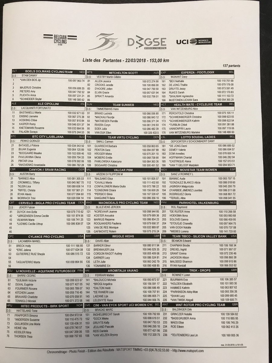 Una edición que ha tenido como destacada a la campeona de España y TOP Ciclo 21 2017, Sheyla Gutiérrez, que se insertó en la fuga del día que duró hasta escasos kilómetros para el final, donde D´Hoore impuso su velocidad ante Hosking y Majerus, que completaron el podio de la prueba. La riojana aún tuvo fuerzas para esprintar y acabar séptima, firmando su primer top 10 del año y acabando como la mejor de las españolas en meta, que cruzaron Alicia González, Alba Teruel y Gloria Rodríguez. Su compañera del Movistar, Lourdes Oyarbide, abandonó.