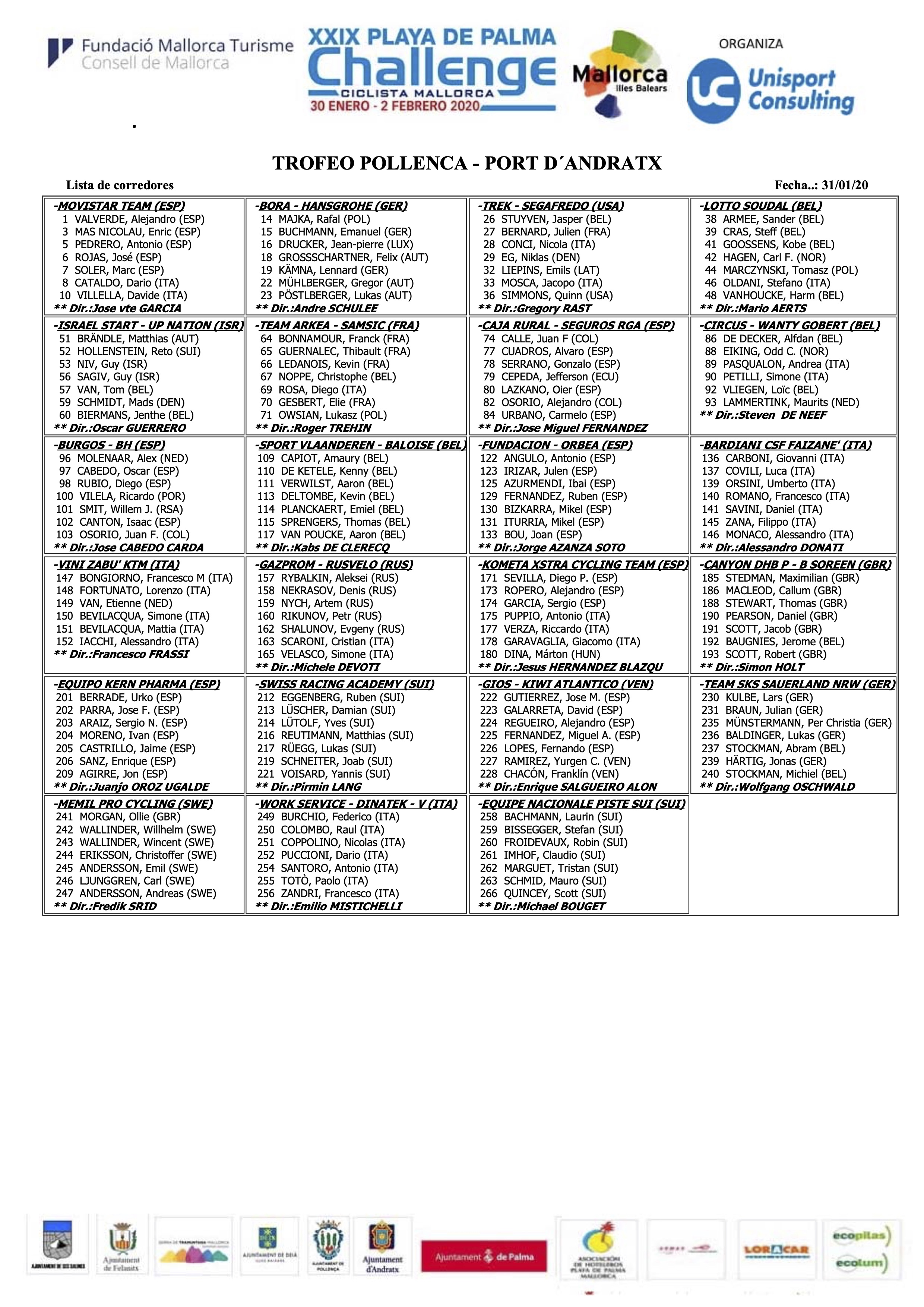 Marc Soler. «Muy contento por esta primera victoria del año, tanto para mí como para el equipo. Ha sido un día muy duro, con mucha locura y también mucho sufrimiento, pero con final feliz. En la bajada del Puigmajor, donde Buchmann ayer nos dejó atrás, el pelotón se ha cortado, y al empezar Bleda ha habido varios ataques que han acabado formando ese grupito de veinte que nos hemos jugado el triunfo. Era un terreno muy duro, con mucho repecho y esa fuga se ha ido cortando poco a poco. En un determinado momento hemos podido abrir hueco Mühlberger y yo de los que iban con nosotros y enseguida hemos encontrado muy buen entendimiento. El otro día vinimos a entrenar por la zona de Andratx y más o menos conocía la última subida, por lo que tenía claro dónde quería arrancar si tenía fuerzas y he podido llegar solo.Contentos de que la semana en Mallorca haya salido bien, con el podio de Alejandro ayer y el triunfo y el 3º de Davide hoy aquí. Ahora vamos a Valencia, donde tendremos un final parecido a este, pero más largo, en Bernia el sábado que viene. Veremos cómo se nos da allí».