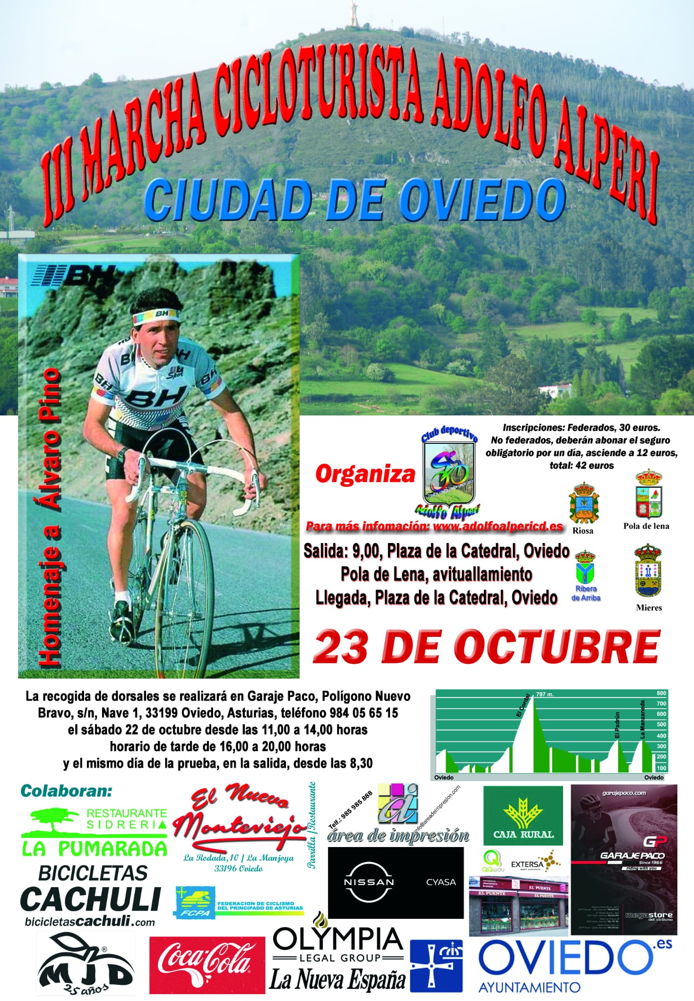 El Club Deportivo Adolfo Alperi organiza la 3ª Marcha Cicloturista Ciudad de Oviedo «Adolfo Alperi». La salida tendrá lugar el domingo 23 de octubre de 2022 a las 9:00, desde la plaza de la catedral de Oviedo. Se trata de una marcha cicloturista, no competitiva autorizada por la Federación Asturiana de Ciclismo y regulada por el artículo 9 reglamento Cicloturismo – Ciclismo para todos de la RFEC.