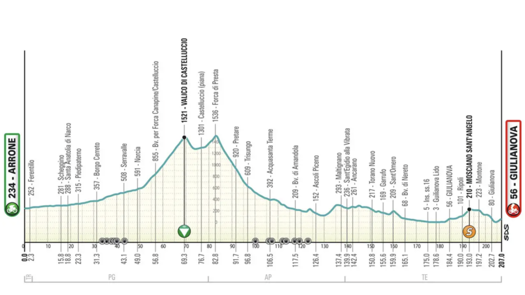 El resto de la etapa solo tuvo el protagonismo de dos valientes que se marcharon pronto en cabeza y rodaron casi cinco horas por delante del pelotón. Samuele Zoccarato (VF Group-Bardiani) y Jan Stöckli (Corratec-Vini Fantini) llegaron a tener más de once minutos de ventaja, aunque el suizo se descolgó a unos 80 kilómetros de meta, quedándose solo el italiano hasta ser alcanzado antes de la única subida puntuable. Juan Ayuso salvó el día y se mantiene al frente de la general, antes de otra para corredores rápidos. Más de 200 kilómetros separarán Arrone de Giulianova, con un puerto de entidad al inicio, el Valico di Castelluccio, y un un circuito final junto a la costa del mar Adriatico que incluye algunos pequeños repechos.