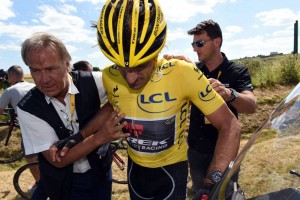 Lo realmente surrealista fue lo que sucedió acto seguido. Apenas dos kilómetros tardó el coche del director de carrera en colocarse en la nariz misma del primer corredor haciendo gestos con los brazos abiertos. Quería que el pelotón frenara. Quería neutralizar la carrera. Cuando parecía que la cosa se había calmado, llegó el equipo Sky y aceleró. Y parecía que la cosa se relanzaba, pero no. Para evitar confusiones, se ordenó detener la carrera. ¡Parar todo un Tour de Francia! Nadie entendía nada. Los corredores preguntaban y se miraban extrañados. Los directores se hacían cruces en sus coches (algunos todavía atendiendo a sus pupilos en el lugar de la caída). Y las redes sociales, siempre las redes sociales, hervían. Como siempre, sin tiempo a la reflexión, hubo quien acusó al Tour de querer esperar a Cancellara, que a todo esto se había vuelto a subir sobre la bici. Pero no, el motivo era mucho más importante que esperar a uno u otro corredor: todas las ambulancias de la carrera se habían detenido para atender a los heridos. Y la ley (además de la normativa interna) es muy clara en este sentido: sin ambulancia, no hay carrera.