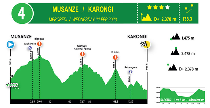 Los pasos de montaña y estas montoneras seleccionaron mucho el gran grupo, que se echó encima de los escapados en los últimos kilómetros de etapa. Antes de que se produjera la neutralización, Mulubrhan realizó una primera tentativa, atacando junto a Vercher, Ormiston, Bonnet y Muhoza. No fue su único movimiento ya que, a 5 kilómetros de la llegada, cuando solo quedaba Fouche en cabeza, volvió a meterse en otro corte en compañía de Lecerf, Tarozzi, Grellier, Iturria, Calzoni, Reinerink, Yemane y Oram. Estos continuos movimientos provocaron que muy pocos corredores llegaran con opciones de victoria a la subida final, donde el eritreo se mostró el más fuerte y se vistió de líder. La carrera continuará en dirección a Karongi con una cuarta etapa aún más exigente, con hasta tres puertos de primera categoría.