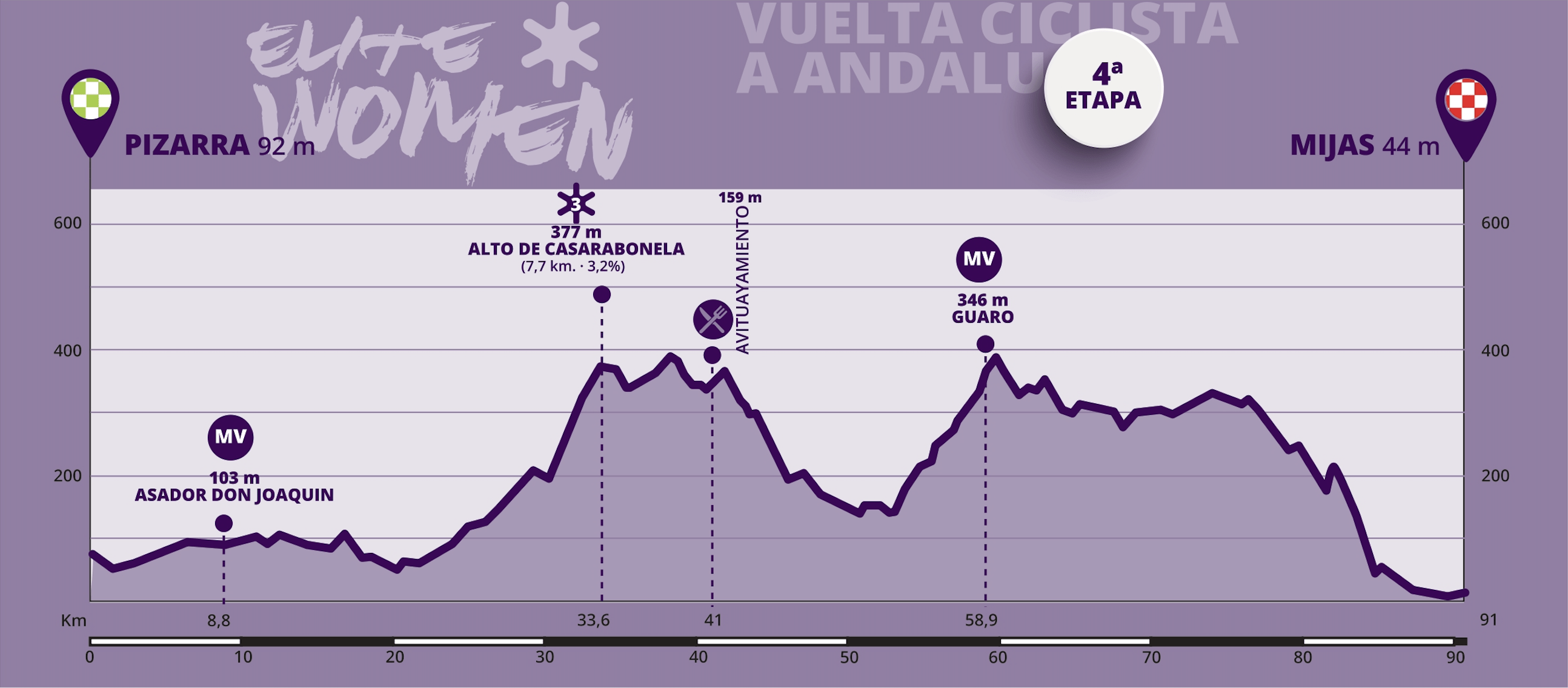 El inicio de la cuarta etapa tendrá su salida en la localidad malagueña Pizarra para llegar a la meta situada en Mijas también provincia de Málaga, con un total de 90,9 km. La etapa consta de un puerto puntuable y dos metas volantes. El puerto es el alto de Casarabonela de 3ª categoría, situado en el km 25,9 y que corona en el 33,6 de la etapa. Las metas volantes son dos, la primera de ellas en el km 8,8 y la segunda en la localidad de Guaro en el km 58,9, que aunque no es puerto puntuable se llega después de una tendida subida de unos 4 km. La meta estará situada concretamente en Las Lagunas de Mijas (casi en la costa) y esta será en una avenida de 8 metros de ancha y picando ligeramente hacia arriba.