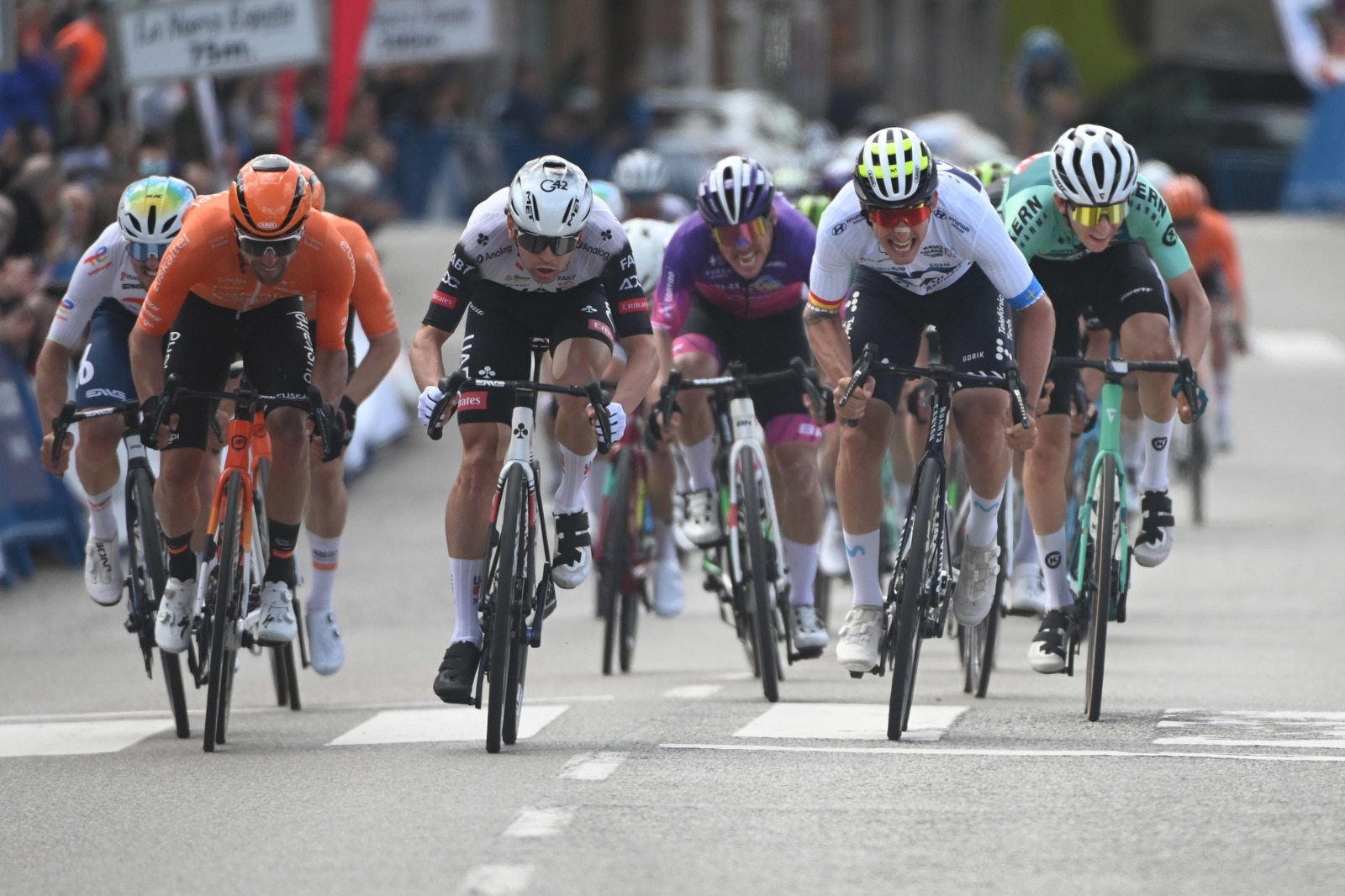 En la terna entre la escapada y el pelotón quedó medio minuto de diferencia. La ventaja fue controlada hasta los últimos 4 kilómetros donde fueron absorbidos. Momento en el que comenzó la pugna por llegar a los puestos de cabeza para lanzar el esprint. Iván García Cortina trataba de adelantarse en la curva previa a la línea de meta. Muy astuto el telefónico. Pero no pudo contra el rodillo de Alessandro Covi, que aguanto su estela para rematar al ‘guaje’ en los metros finales. Jordi Lópz (Euskaltel) atravesó en segunda posición y Gª Cortina (Movistar) en tercera.