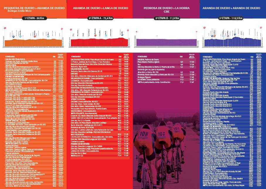 El sábado 19 será el día de la jornada doble. Por la mañana, la segunda etapa de 73 kilómetros entre Aranda de Duero y Langa de Duero. Por la tarde, una crono por equipos entre Pedrosa de Duero y la Horra, con 12 kilómetros de recorrido. El domingo se cerrará esta segunda edición de la Vuelta a la Ribera del Duero Júnior con la etapa con salida y llegada en Aranda, de 119,5 kilómetros. En total el pelotón júnior completará casi 277 kilómetros. La Plaza Mayor acogerá la correspondiente entrega de premios.