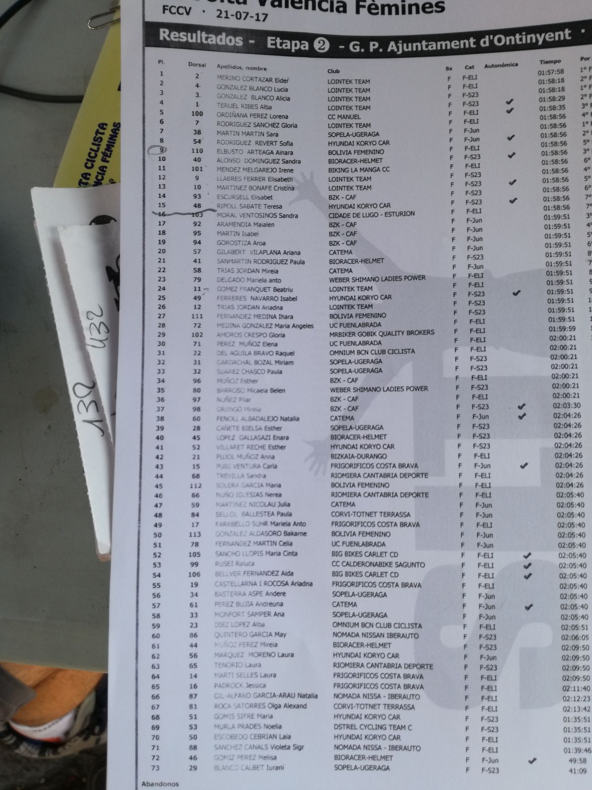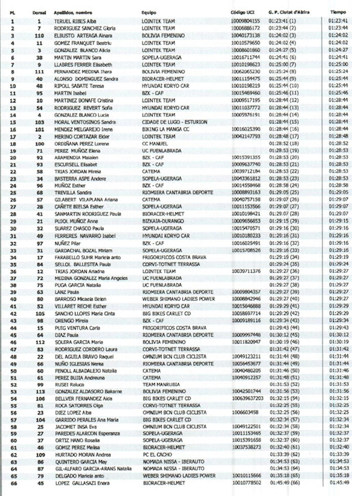 | 30. | 22 | DEL AGUILA BRAVO Raquel | OMNIUM BCN CLUB CICLISTA | F | F-ELI | 05:58:50 | 34,03 | 14 |