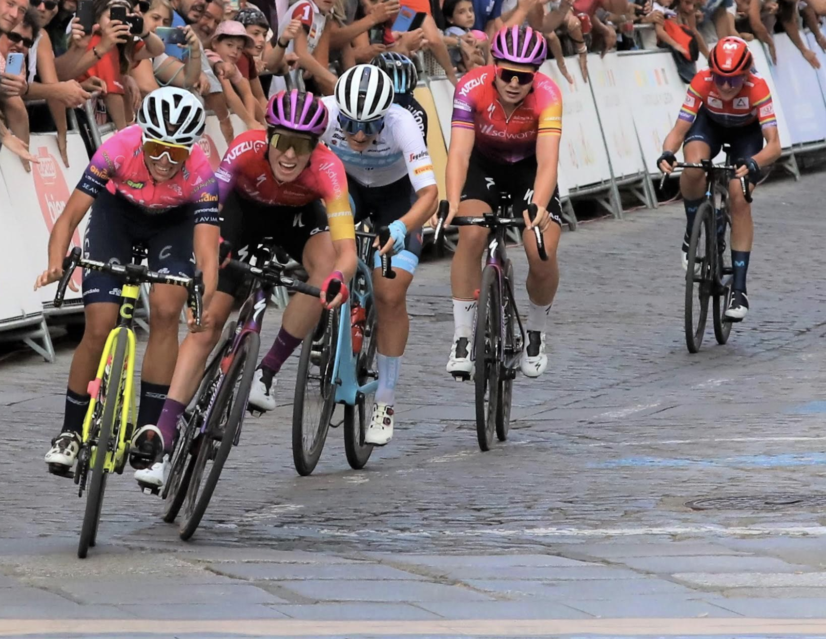 Kiesenhofer, que debutaba en competición con el Soltec, fue engullida por el grupo en el comienzo de la ascensión final. Grace Brown (FDJ Futuroscope), Van Vleuten y Longo Borghini tensaron la carrera aunque fue Silvia Persico quien emergió en los últimos 150 metros para derrotar a Vollering en el último golpe de riñón. Gracias a su victoria, la transalpina se enfunda momentáneamente el verde de la regularidad.