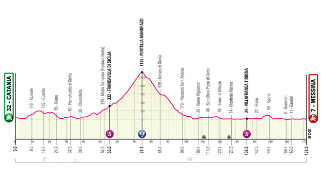 Etapa clásica del Giro en Sicilia. De Catania a Messina partiendo de la costa este para llevarte a través de Portella Mandrazzi y sus suaves laderas, en la costa norte donde tocas lugares como Villafranca Tirrena, Ganzirri con el enorme Pilón del Estrecho de la antigua línea eléctrica. Una etapa para velocistas que presumiblemente verá un sprint de grupo compacto al final.