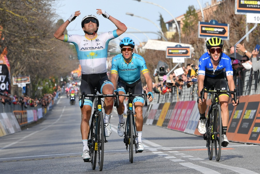 Alexey Lutsenko lo resiste todo. 221kms entre Foligno y Fossombrone que no se olvidarán fácilmente para el joven kazajo. A 35 kilómetros de la conclusión hizo su apuesta personal, el campeón kazajo cayó en dos ocasiones, una a 15 km de la llegada y otra a menos de un km y con los favoritos pisándole los talones. Aún siendo absorbido por Roglic, A. Yates y su compañero Fuglsang, encontró las energías físicas y mentales para rehacerse y ganar el sprint frente a corredores, en teoría, más frescos y rubricar una actuación que ya es historia de la Tirreno Adriático. Una exhibición memorable que supone la quinta victoria de la temporada para Lutseno y la 17ª del Astana, a mediados de marzo.