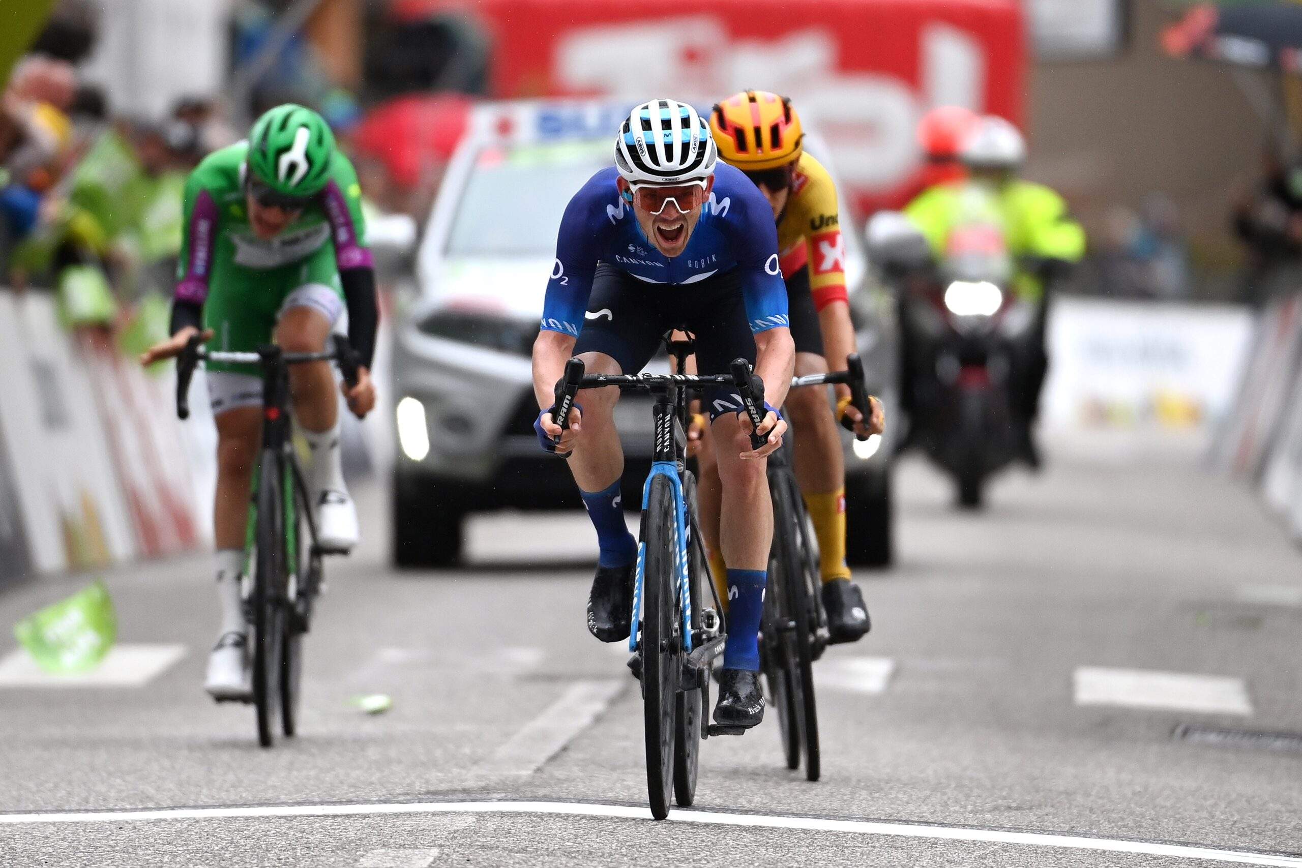 [divder]Tres años después de su triunfo en la general del Sibiu Tour de 2020, Gregor Mühlberger por fin ha conseguido su primera victoria con el conjunto Movistar. El austriaco no había logrado mostrar su mejor nivel en las dos primeras temporadas con la escuadra telefónica, pero pudo desquitarse en la cuarta etapa del Tour de los Alpes. El conjunto telefónico metió a cuatro hombres en la numerosa fuga que acabó disputándose la etapa. En el ascenso al Passo Pramadiccio, el austriaco atacó pronto y tan solo Torstein Traeen (Uno-X) y Giulio Pellizzari (Green Project) pudieron seguirle. El italiano se mostró más fuerte en la subida, pero su falta de habilidad en la bajada dio una segunda oportunidad a Mühlberger, que no falló en el sprint final.