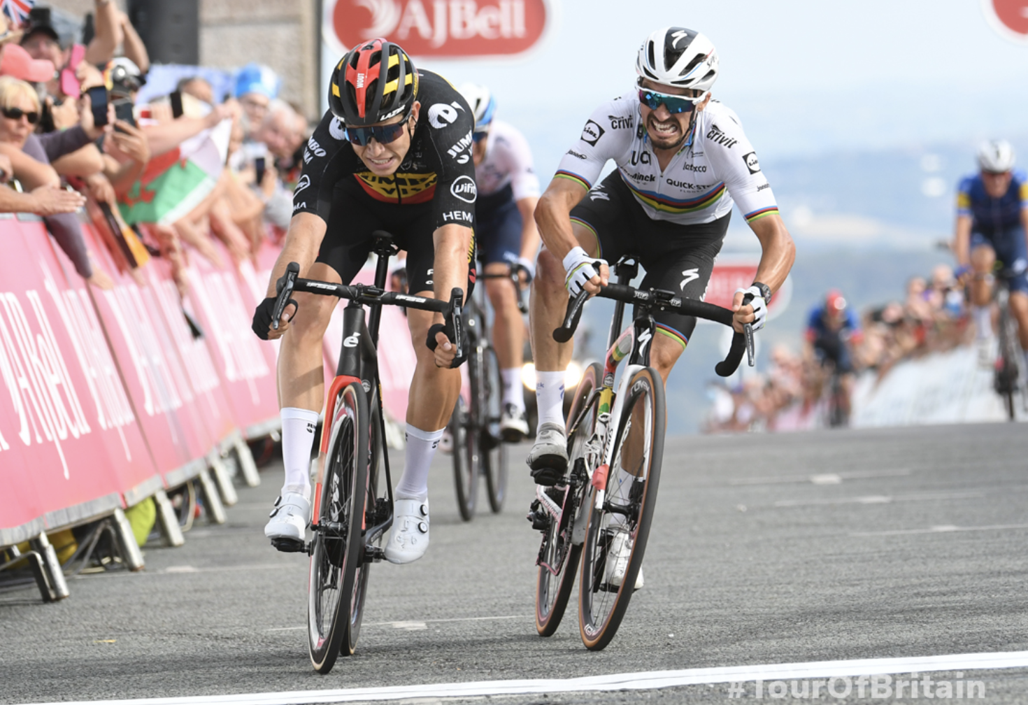 Wout Van Aert (Jumbo) recuperó el liderato del Tour de Britain (Vuelta Gran Bretaña) tras ganar por la mínima y en un espectacular sprint en subida superando a Julian Alaphilippe (Deceuninck), los dos primeros en el pasado Mundial de Imola tras ceder el canadiense Michael Woods (Israel). El ya exlíder Ethan Hayter (Ineos) -por las bonificaciones- no pudo en principio con el trío, pero ante el parón delantero volvió a sus ruedas. En ese momento atacó Mikkel Honoré -que iba con el británico- haciendo labor de equipo, pero el campeón belga no se dejó sorprender. Alaphilippe contragolpeó, pero Van Aert remachó para su nuevo doblete casi en la línea de meta. Sergio Martín (Caja Rural) -que se retiró en la pasada Vuelta a España- aguantó a los mejores casi hasta el final y terminó 9º y mejor español.