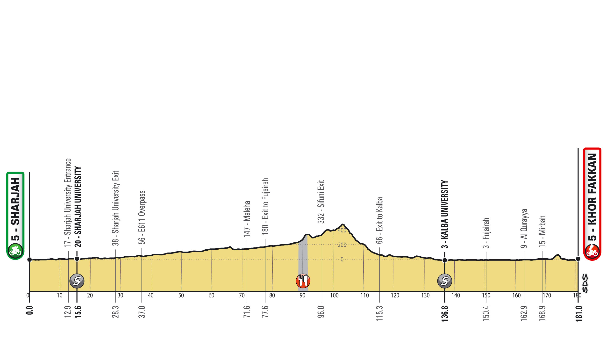 La quinta jornada del Tour de los Emiratos Árabes, de 181 kilómetros entre Sharjah y Khor Fakkan, parece destinada al sprint. Solo la irrupción del viento y un repecho a cinco kilómetros de la llegada podrían romper la llegada masiva. Fernando Gaviria (UAE Emirates), ganador en la segunda etapa, Elia Viviani (Deceuninck-Quick Step) y Ewan son los principales favoritos.