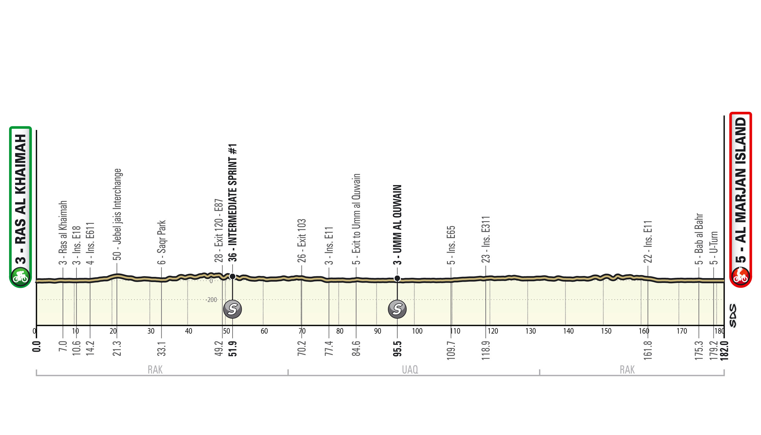 Aprovechando la distancia conseguida en el segundo esprint intermedio, Dmitry Strakhov (Gazprom), Jasper Philipsen y Jonas Rickaert (Alpecin) se han mantenido fugados hasta que el pelotón los ha alcanzado algunos kilómetros después. No ha sido hasta que ha comenzado la ascensión final a Jebel Jais cuando el gran grupo ha neutralizado al dúo escapado.