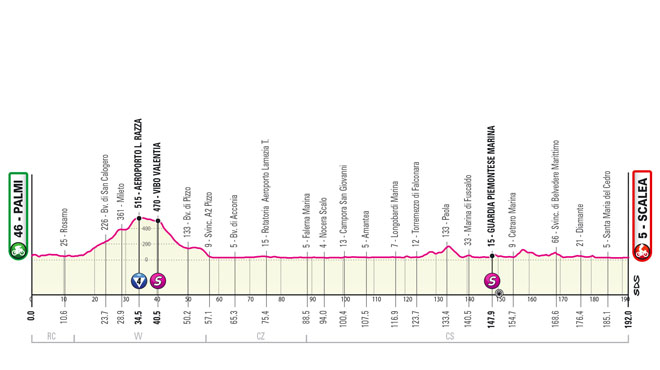 Tras el traslado en ferry hasta la península itálica, se afrontará una etapa ligeramente ondulada una vez más probablemente para terminar con un sprint. Después de una primera parte ligeramente accidentada entre Mileto, Vibo Valentia y Pizzo, la carrera sigue la costa Tirrena de Calabria con sus pequeñas ascensiones. Final que promete ser muy rápido para un pelotón numeroso.