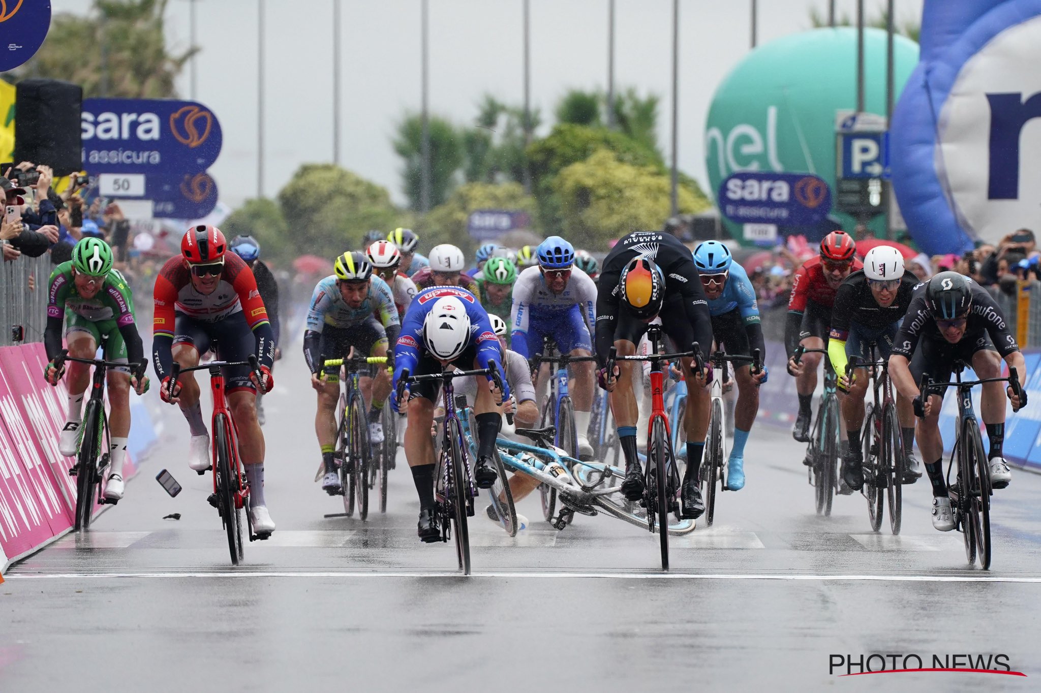 La otra imagen de la jornada fue la de Mark Cavendish que, tras un primer susto al ser cerrado por Alberto Dainese -que acabó siendo sancionado-, golpeó contra Filippo Fiorelli, que se arrastró por la valla, logrando evitar la caída, pero no así un importante corte en la mano. El británico, por su parte, salió despedido hacia el lado contrario por un nuevo patinazo de su rueda trasera y se llevó por delante a varios ciclistas al cruzar la meta, incluido Andrea Vendrame, que fue evacuado en camilla. Los jueces de carrera tuvieron una tarde bastante ajetreada, tratando de determinar cuántos corredores se habían ido al suelo en cada caída, así como los médicos de cada equipo, ante un posiblemente amplio parte de lesiones.